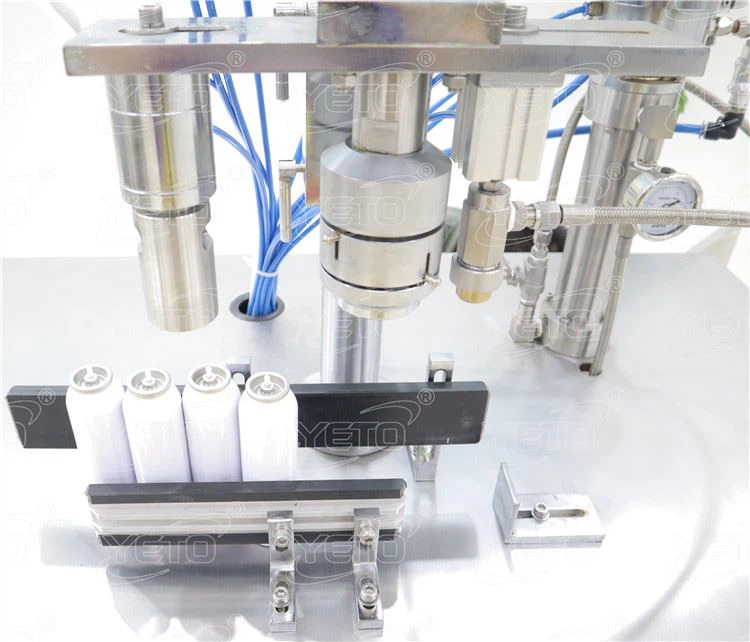 Wanneerer zijn flessen gepasseerd, de ventielen worden handmatig in de fles gezet. Onder het platform zal de fles met klep naar de sealkop gaan. Het keurt het buitenste grijptype goed of drukt in het type blikken verzegeling. De verzegelende kop is speciaal ontworpen volgens klep. Wanneer u de fles verzegelt, drukt u eerst op de klep om deze te positioneren, waarna de afdichtingsklauw de fles verzegelt. De luchtdichte cirkel in het ventiel is nauw verbonden met de fles, dus dat is het ook!mooizonder lekkage.