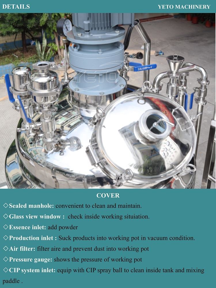 Deze machine wordt gebruikt voor cosmetische crèmes en lotions. De vacuümemulgator is professioneel ontworpen volgens het zalfproductieproces van cosmetica en zalven enz. Producten door geavanceerde technologie uit het buitenland te introduceren. De machine-eenheid is samengesteld uit een voorbehandelingsketel, een vacuüm-emulgerende en mengketel, een vacuümpomp, een hydraulisch systeem, een stortsysteem, een elektrisch regelsysteem en een werkplatform enz. De machine-eenheid wordt gekenmerkt door een eenvoudige bediening, stabiele prestaties, goede homogenisatieprestaties, hoge productie-efficiëntie, gemakkelijke reiniging, redelijke structuur, klein landoppervlak en hoge automatische graad enz